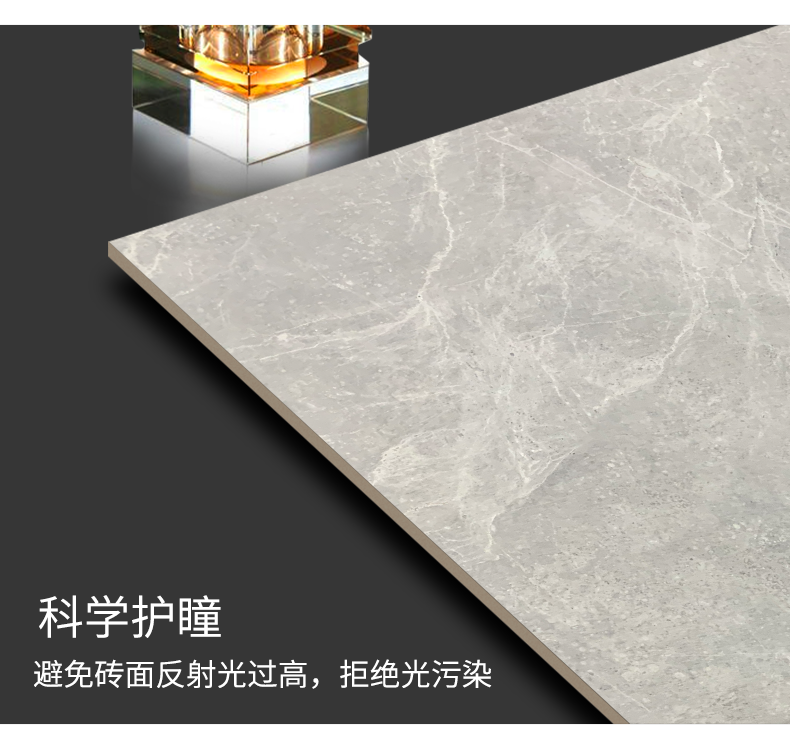 柔光瓷磚是磚面反射介于強光與弱光之間的一類瓷磚,其結合亮光類瓷磚的高調明艷裝飾和啞光類瓷磚的低調內斂搭配效果,通過動態柔光蠟拋技術,降低產品反光率,從而達到人體舒適的視覺感受以及無光污染的空間裝飾效果。優點:1.視覺舒適,無光污染 2.堅固耐磨,不易刮花.