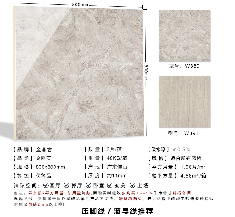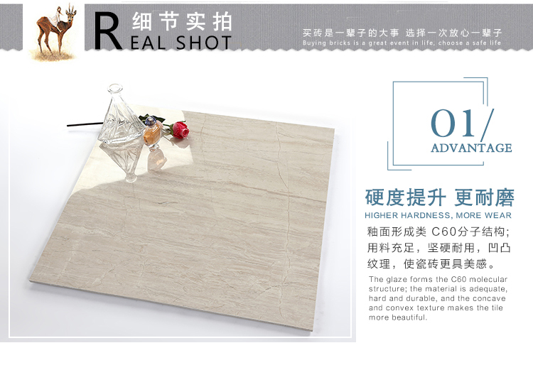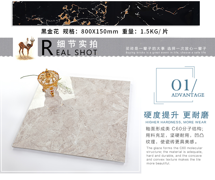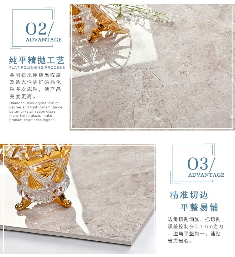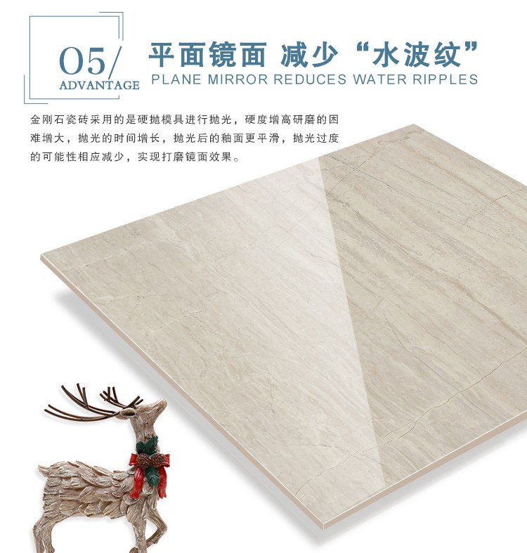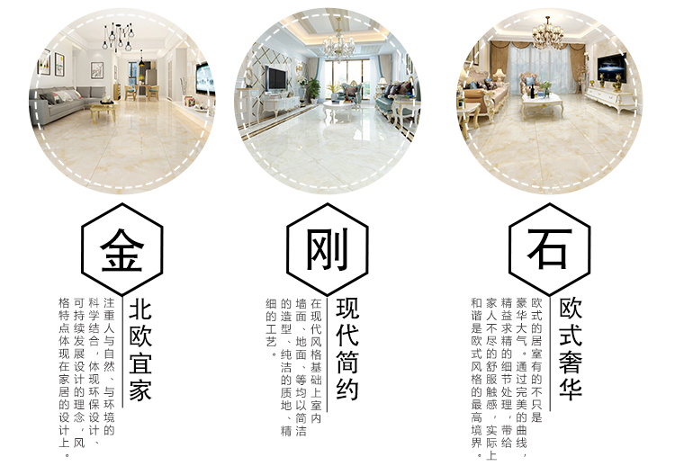 金曼古瓷磚廠家特價金剛石因高品質(zhì)而得名,是一款極具天然石材效果和微晶石質(zhì)感的仿石材瓷磚,它不但在價格、環(huán)保、耐用和清潔上極具優(yōu)勢,在質(zhì)感、規(guī)格、花色、重量等指標(biāo)上,金剛石都遠(yuǎn)遠(yuǎn)勝于石材、拋光磚。相比其他種類的產(chǎn)品,它最大的特點可以用“高亮度、高耐磨、高平整、高逼真、高清晰、高環(huán)保”。