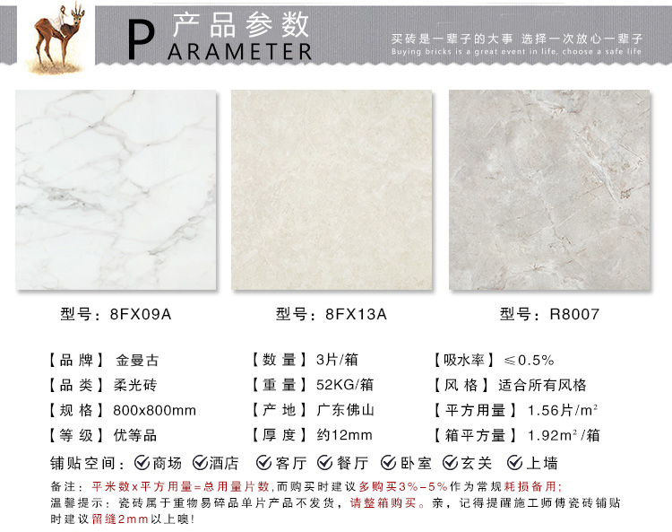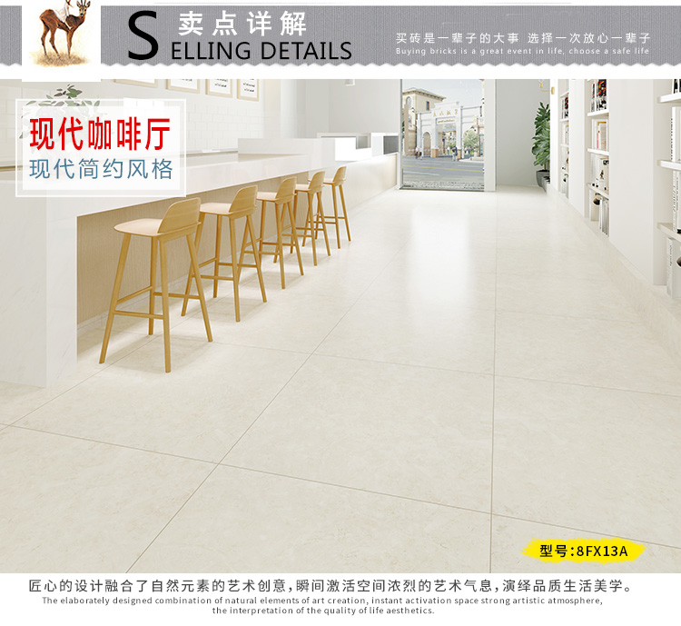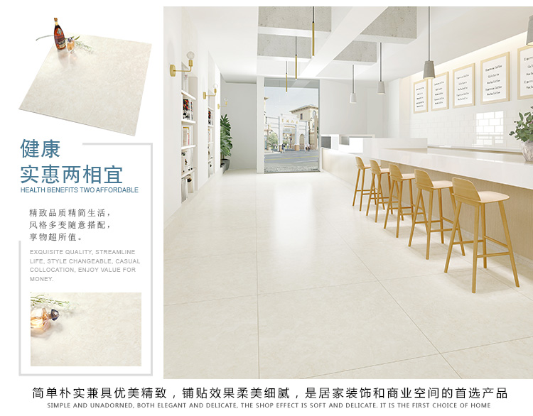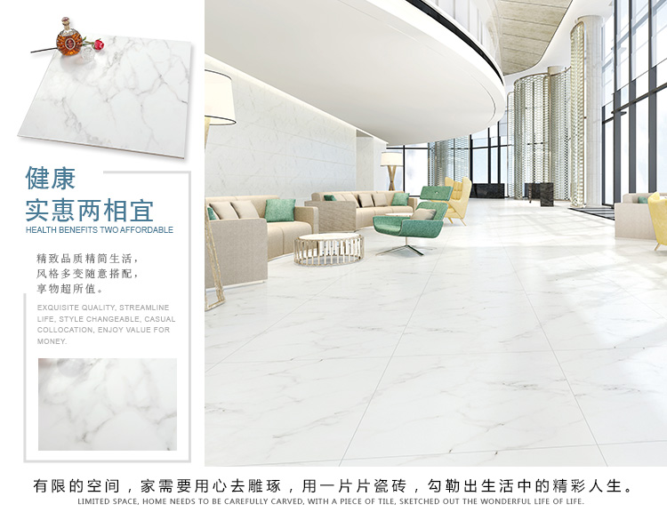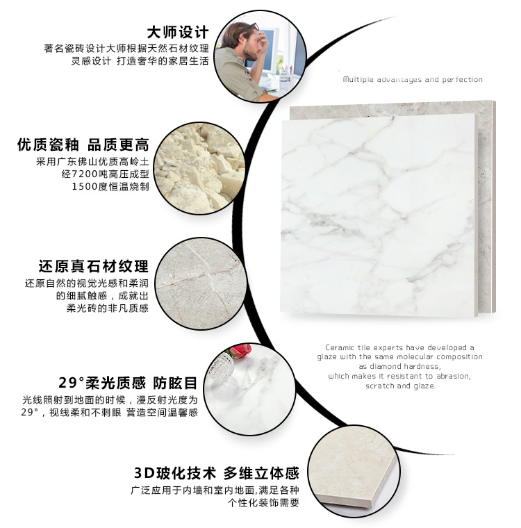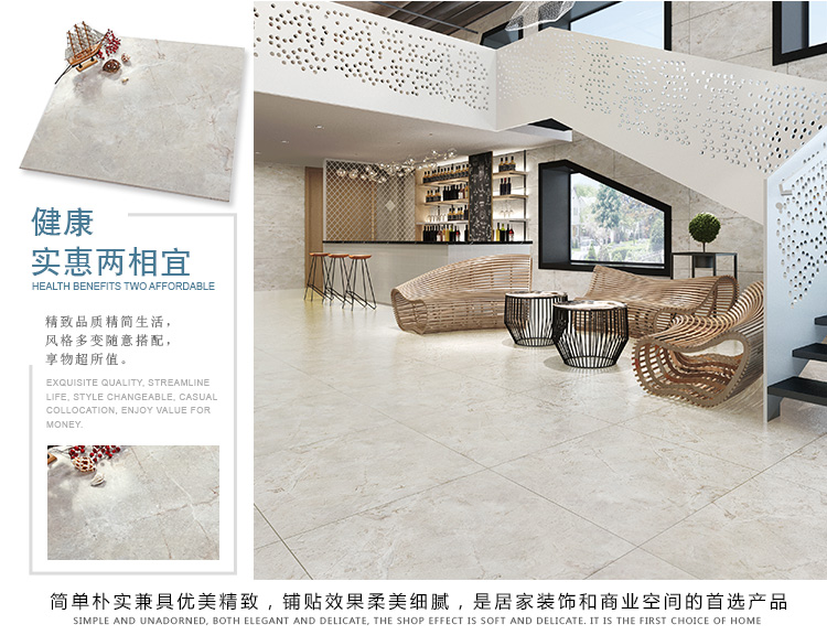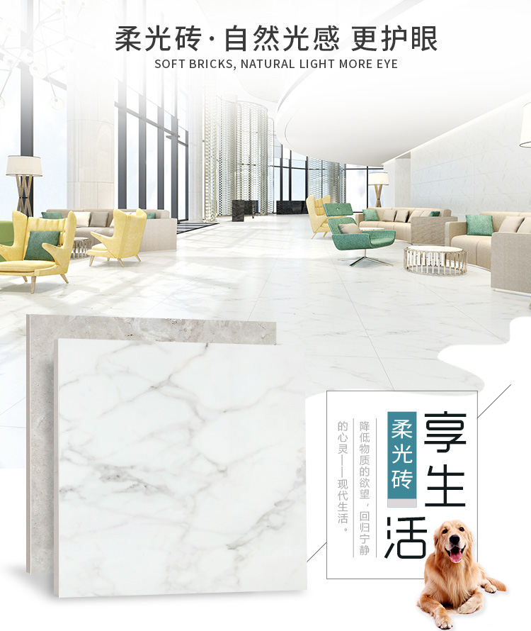 柔光瓷磚是磚面反射介于強光與弱光之間的一類瓷磚,其結合亮光類瓷磚的高調明艷裝飾和啞光類瓷磚的低調內斂搭配效果,通過動態柔光蠟拋技術,降低產品反光率,從而達到人體舒適的視覺感受以及無光污染的空間裝飾效果。優點:1.視覺舒適,無光污染 2.堅固耐磨,不易刮花.