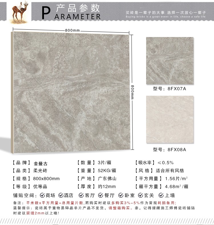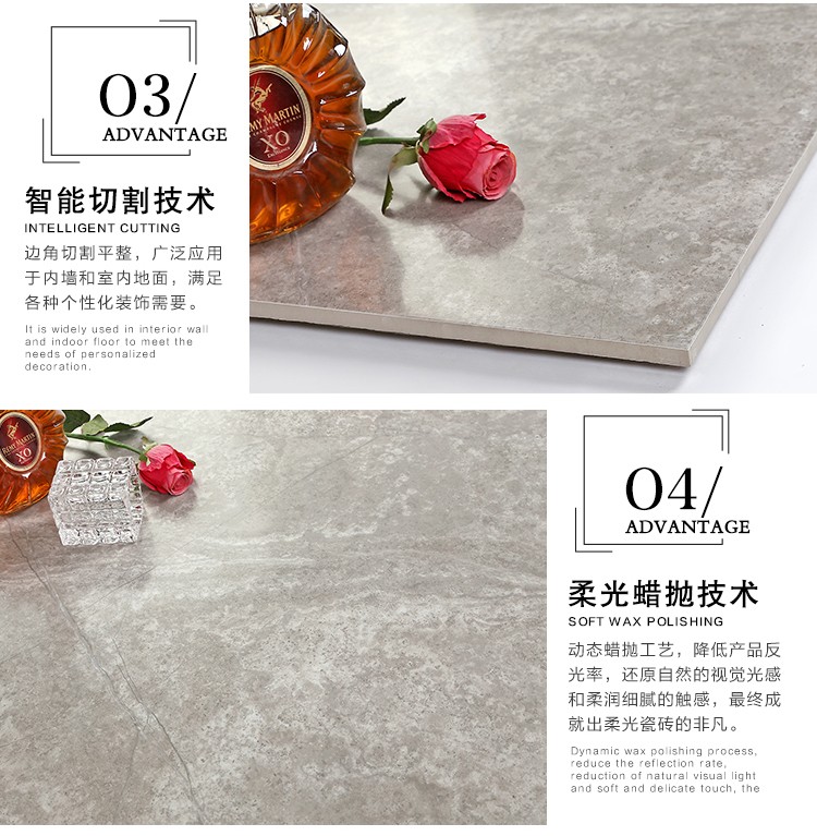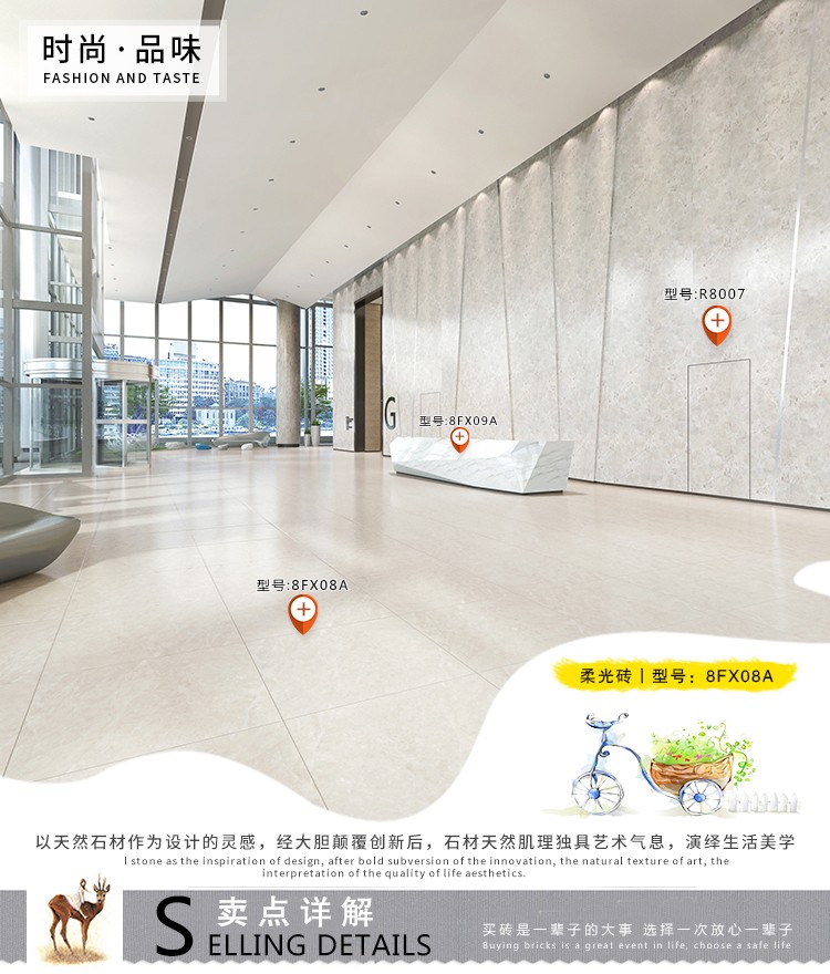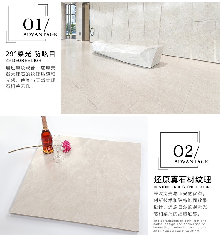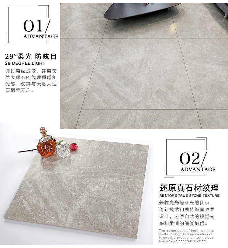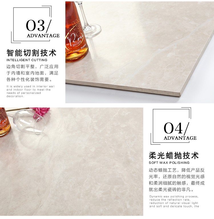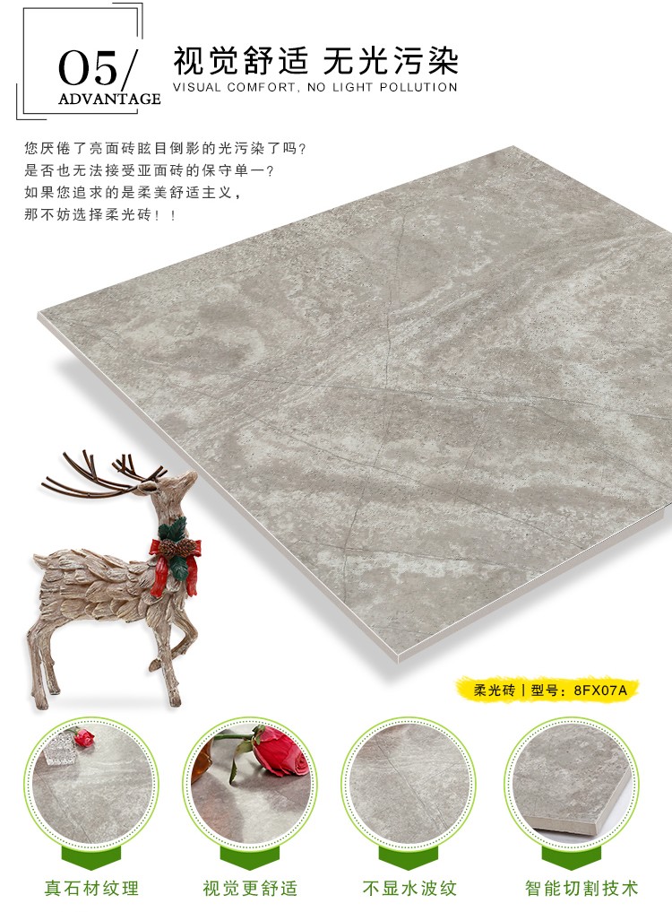 柔光瓷磚是磚面反射介于強(qiáng)光與弱光之間的一類(lèi)瓷磚,其結(jié)合亮光類(lèi)瓷磚的高調(diào)明艷裝飾和啞光類(lèi)瓷磚的低調(diào)內(nèi)斂搭配效果,通過(guò)動(dòng)態(tài)柔光蠟拋技術(shù),降低產(chǎn)品反光率,從而達(dá)到人體舒適的視覺(jué)感受以及無(wú)光污染的空間裝飾效果。優(yōu)點(diǎn):1.視覺(jué)舒適,無(wú)光污染 2.堅(jiān)固耐磨,不易刮花.